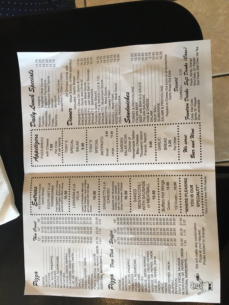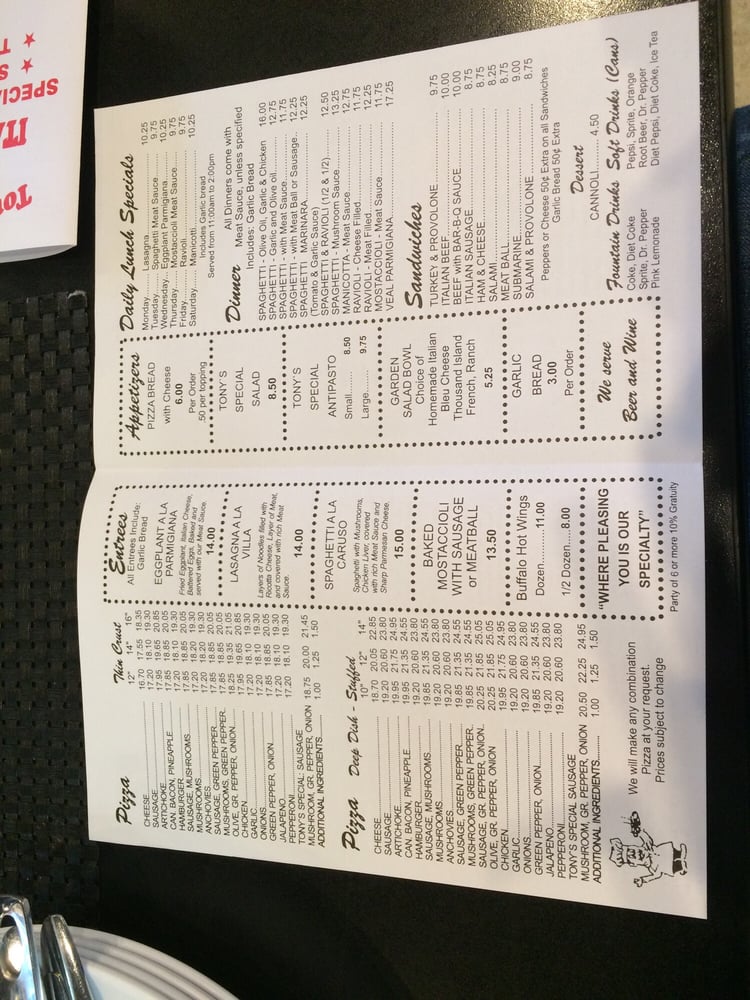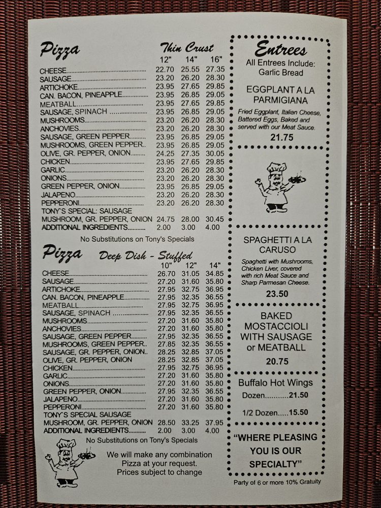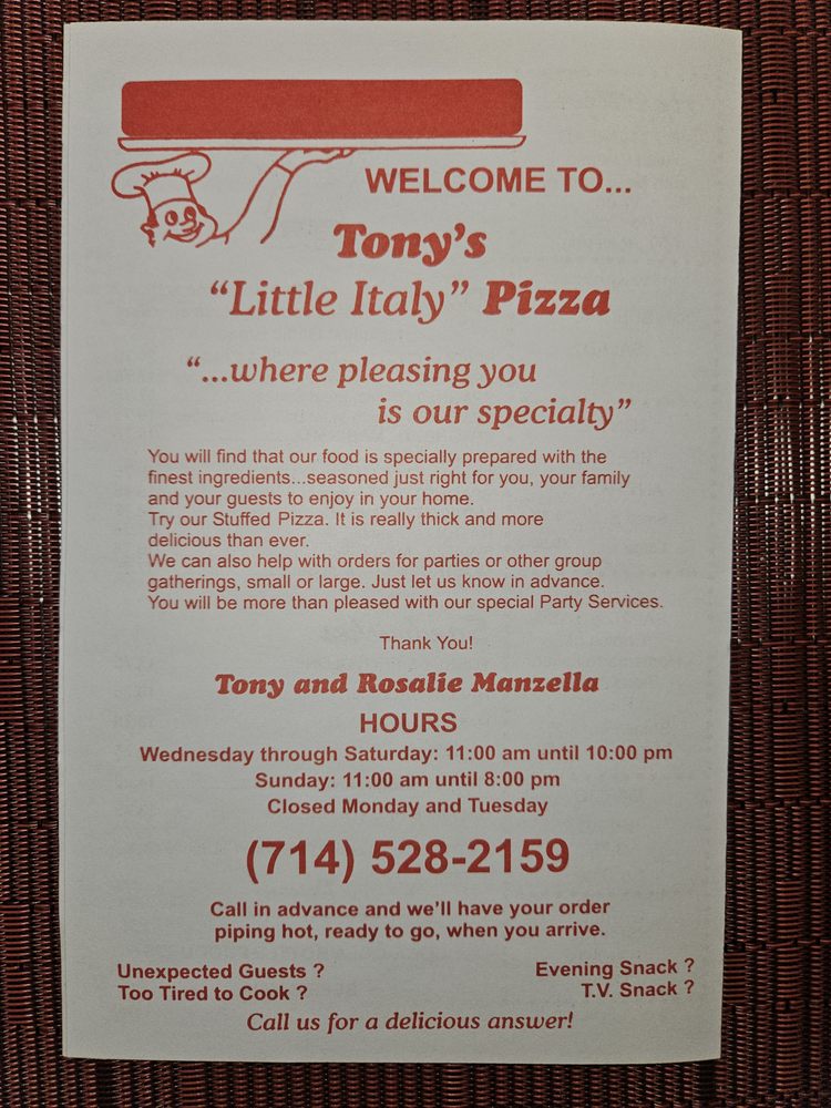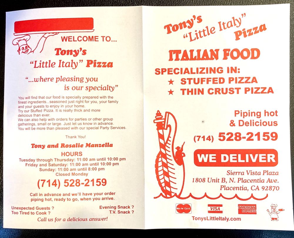 Tony’s Little Italy Pizza in Placentia, CA is a haven for pizza lovers. This casual eatery offers a wide range of Italian dishes, including appetizers like Pizza Bread with Cheese and Tony's Special Salad. The menu also features hearty entrées like Eggplant A La Parmigiana and Baked Mostaccioli with Meatball or Sausage. A standout dish is the Spaghetti A La Caruso, a flavorful pasta dish that embodies the essence of Italian cuisine. With options for vegetarians and a variety of amenities like outdoor seating and Wi-Fi, Tony’s Little Italy Pizza caters to a diverse range of diners. Whether you're looking for a quick lunch or a relaxed dinner with friends, this pizzeria has something for everyone.