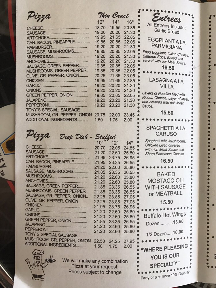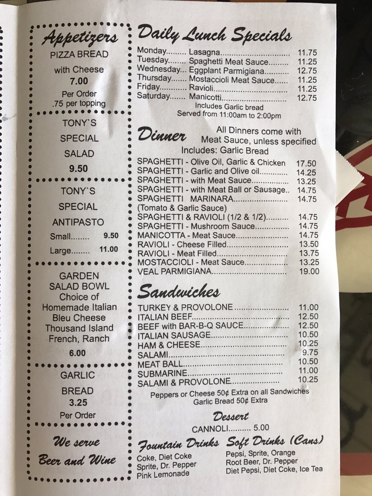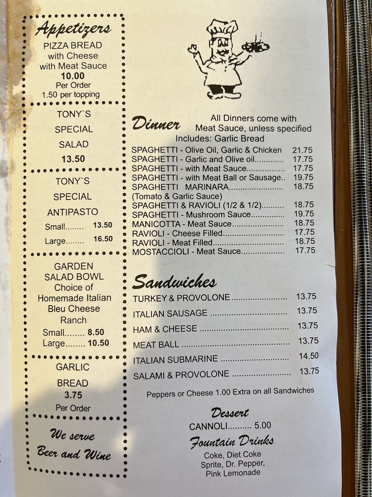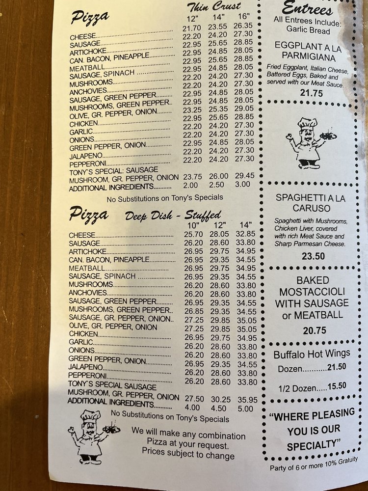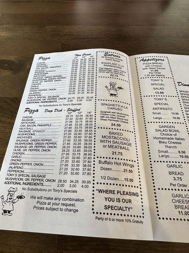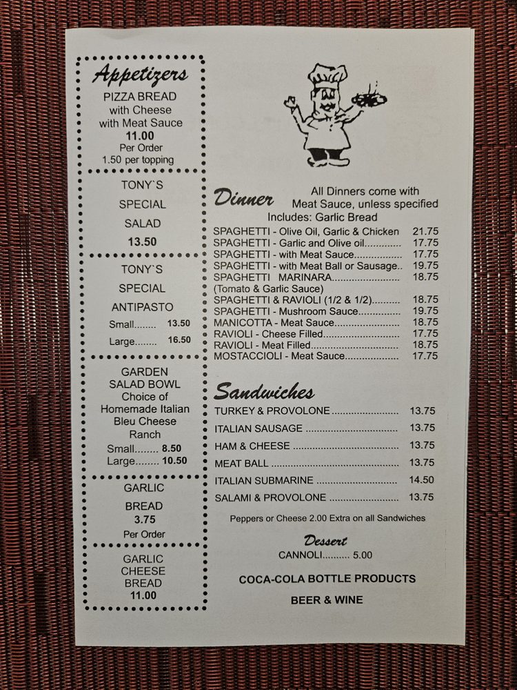 Tony’s Little Italy Pizza in Placentia, CA is a haven for pizza lovers. This casual eatery offers a wide range of Italian dishes, including appetizers like Pizza Bread with Cheese and Tony's Special Salad. The menu also features hearty entrées like Eggplant A La Parmigiana and Baked Mostaccioli with Meatball or Sausage. A standout dish is the Spaghetti A La Caruso, a flavorful pasta dish that embodies the essence of Italian cuisine. With options for vegetarians and a variety of amenities like outdoor seating and Wi-Fi, Tony’s Little Italy Pizza caters to a diverse range of diners. Whether you're looking for a quick lunch or a relaxed dinner with friends, this pizzeria has something for everyone.